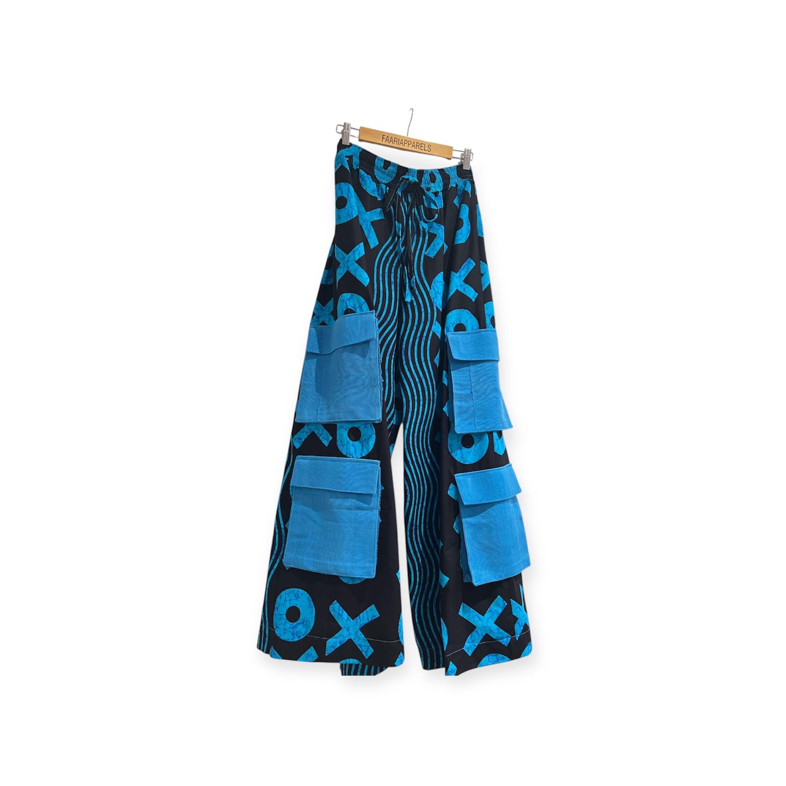 The ELORA double combat pocket loose fit pants is made with 100 percent cotton (Ankara) carefully sourced from the heart of Africa cut and sew to finish in the United Kingdom this beautiful piece is made with love to fit women of different sizes color and ethnic.