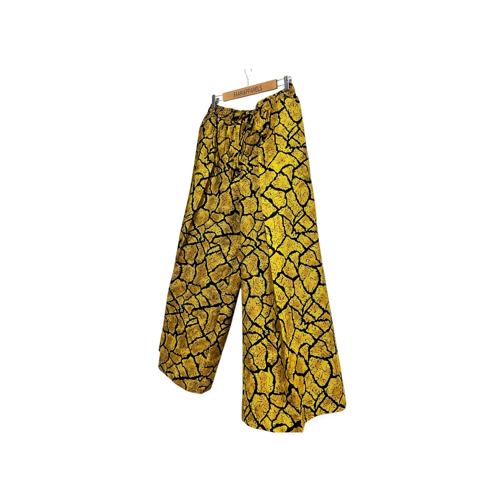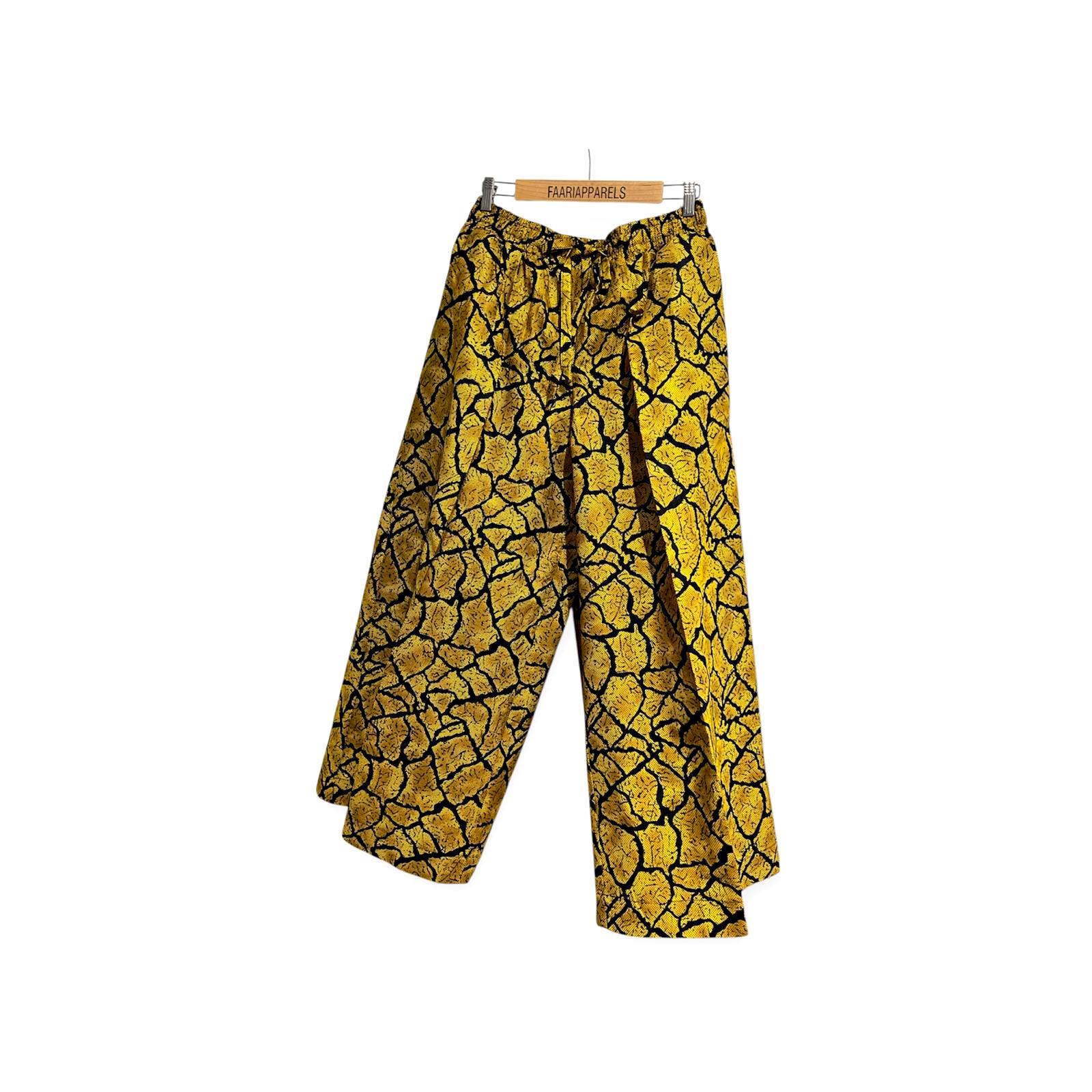 The ELSA pant in gold with side seam pocket loose fit pants is made with 100 percent cotton (Ankara) carefully sourced from the heart of Africa cut